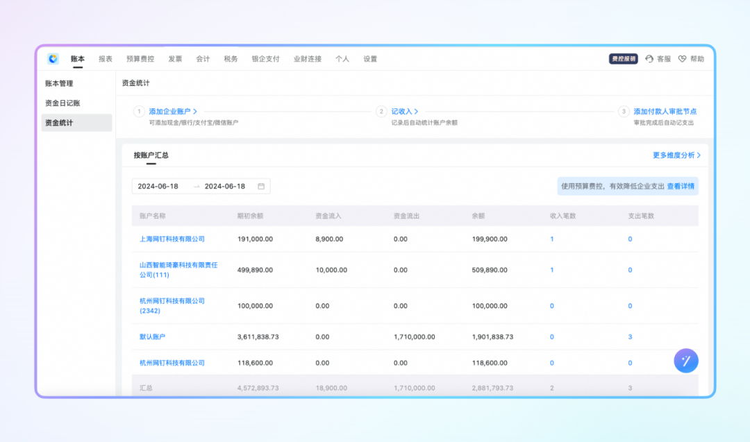 智能财务支持添加企业账户,银行流水可自动生成日记账,账目明细准确清晰,资金管理安全便捷。