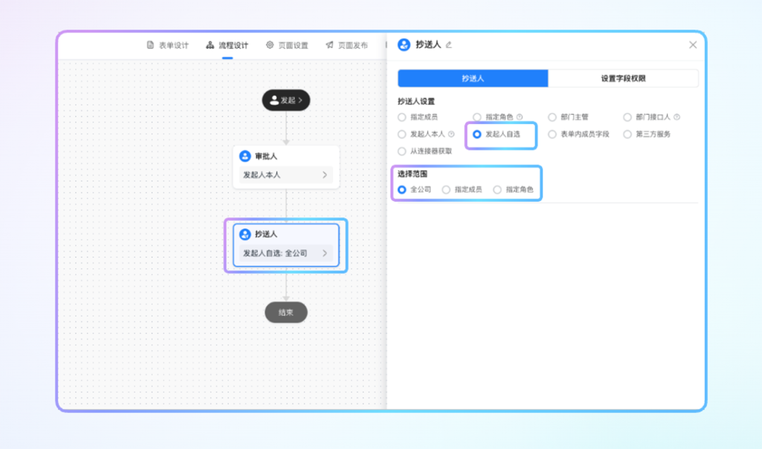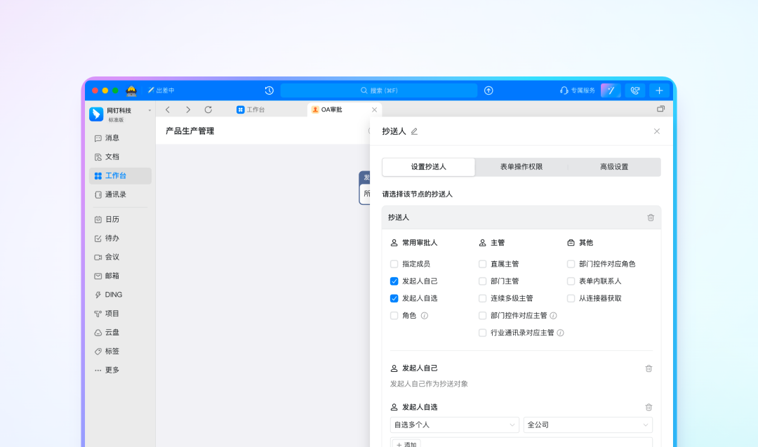 支持流程发起人根据业务需求,动态选择指定的抄送人,审批流程更灵活高效。