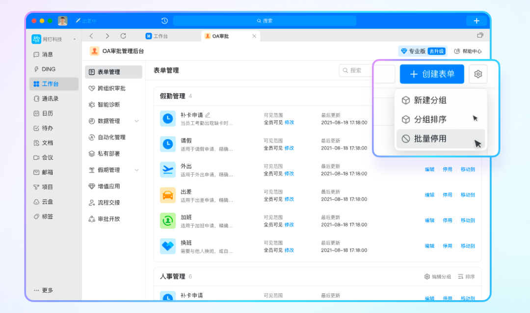 支持通过「表单管理」的右上角设置图标打开「批量停用」选择界面,一键整理冗余信息,统筹管理更高效。