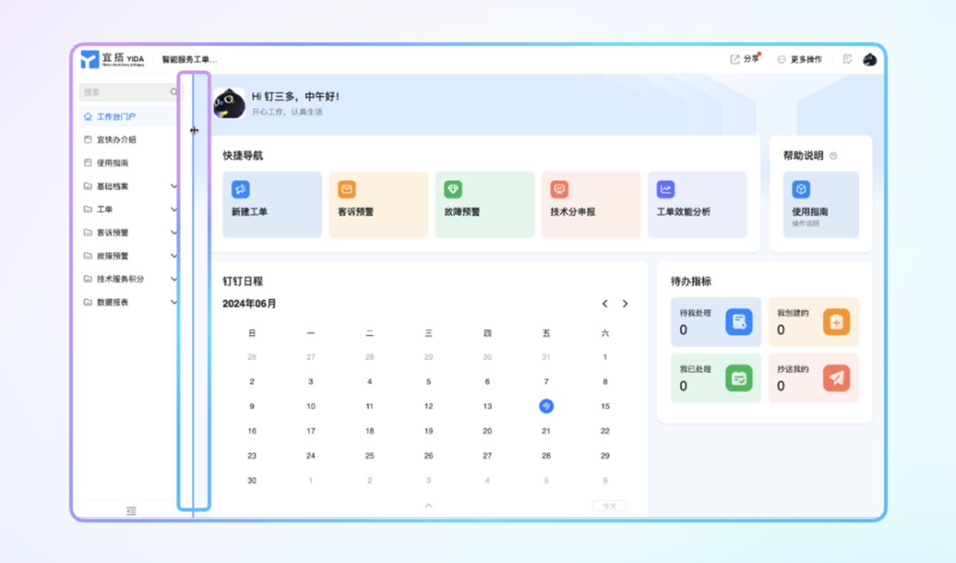 支持通过拖动设定宜搭工作台左侧菜单栏宽度,界面布局设置更灵便,更好地适配你的使用习惯。