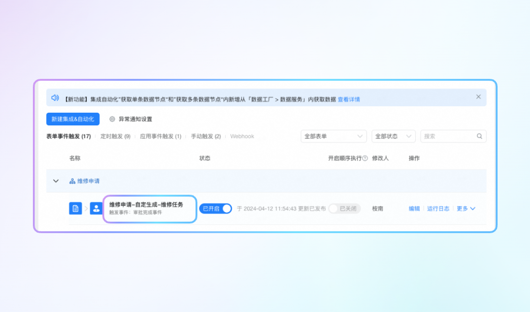 集成自动化定时触发节点,除手动添加的数据外,新增通过集成自动化流程插入的数据同样能够触发相关自动化流程,流程运转更轻松智能。