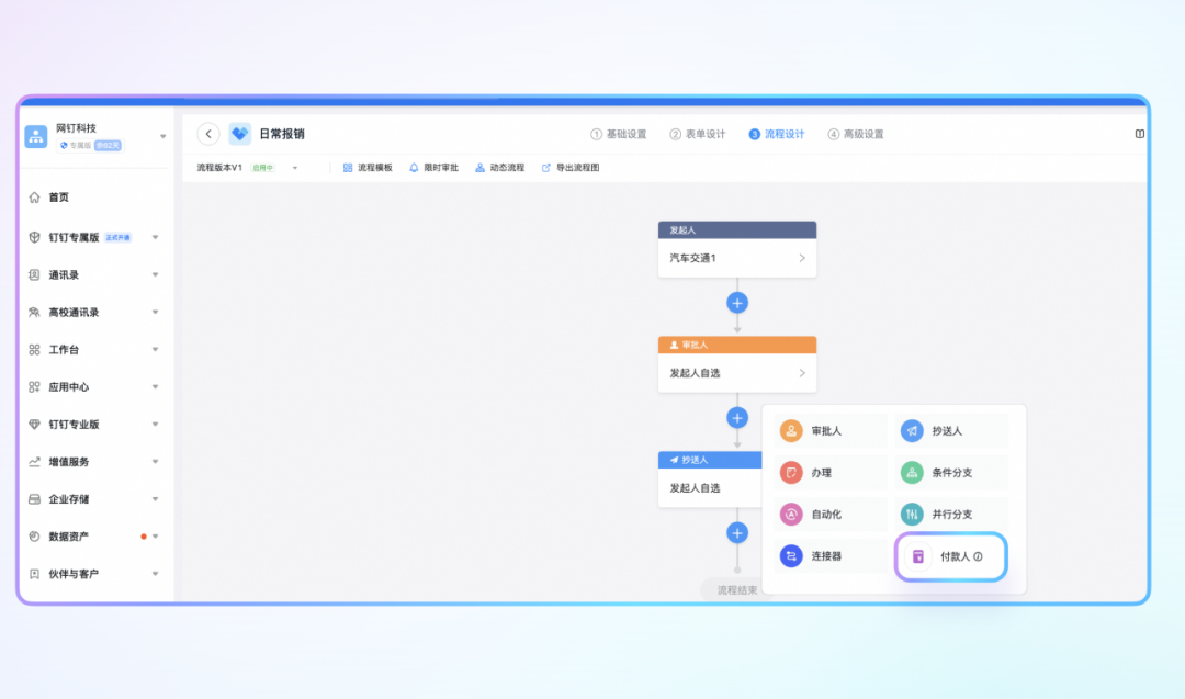 审批表单流程中支持添加「付款人」,可在线支付并管理待付款表单,线上流程省时省力,在线支付安全便捷。