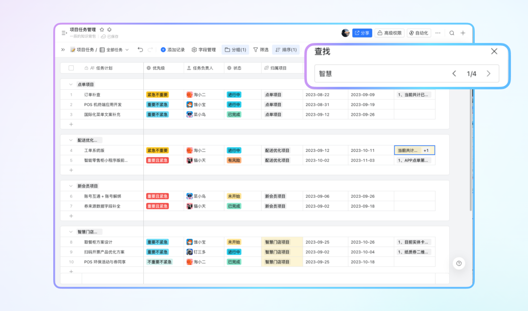 支持在筛选、分组、排序中进行字段查找,快速直达目标数据,大大提高查找效率,让复杂的数据管理变得简单直观。