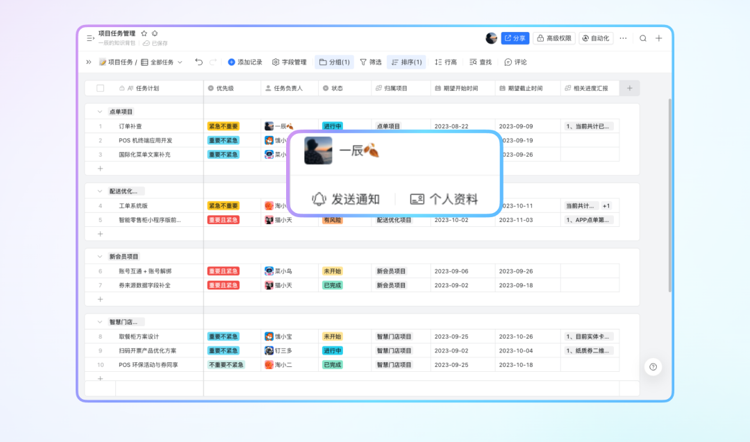 只需将鼠标轻轻悬停在「人员」字段上,成员资料卡片即刻呈现,还可一键精准发送通知,让团队协作流畅无阻,信息同步更即时。