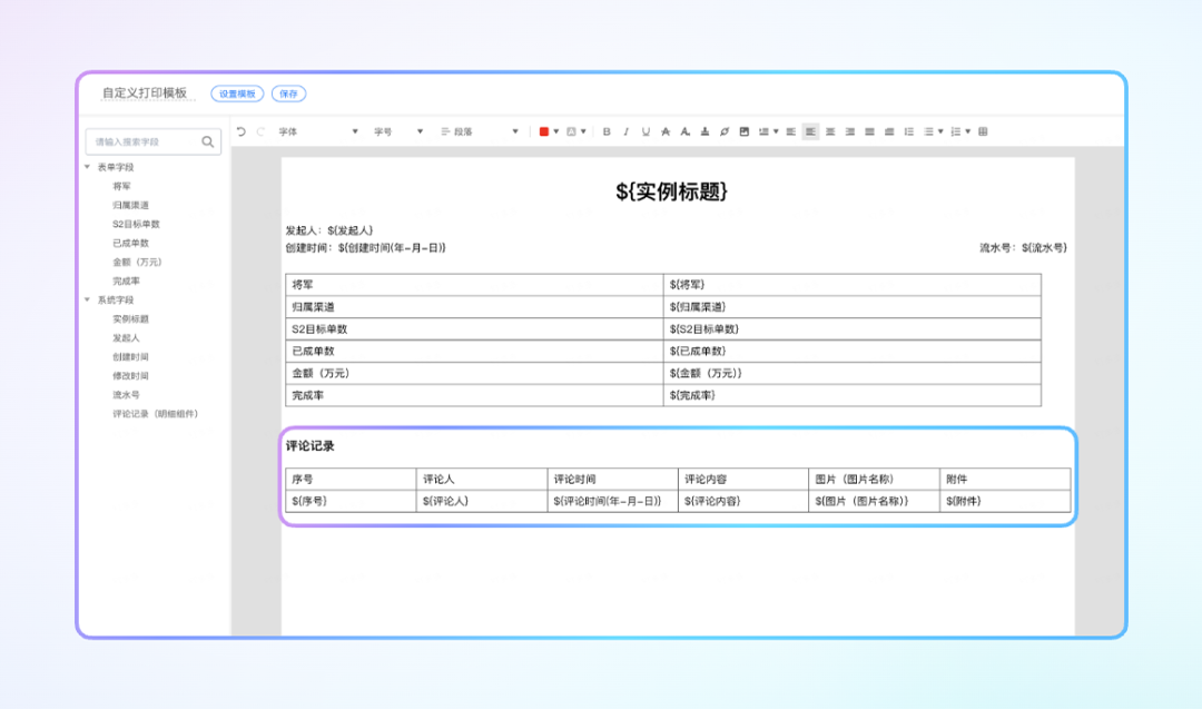 支持通过「打印设置」新建打印模板,打印表单时可同步打印表单评论,让信息导出更完整全面。
