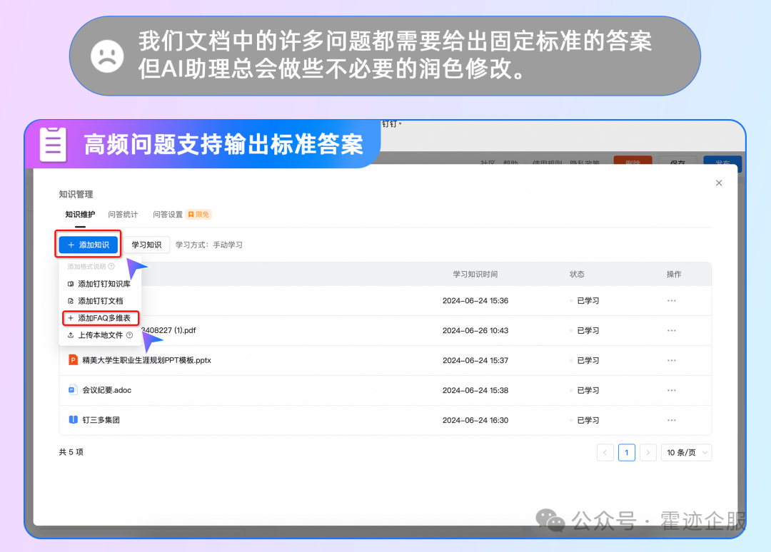 AI助理现支持上传FAQ多维表。你可以将高频问题及其标准答案整理成多维表,一键导入AI助理。当遇到类似问题时,AI助理就能迅速给出标准回答,提升服务效率。