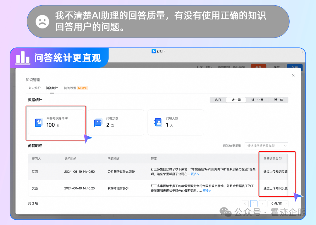 新增的知识命中率统计功能,让你直观了解AI助理的回答效果。同时,问答明细还支持查看知识引用情况,让你对AI助理的回答来源有更深入的了解。